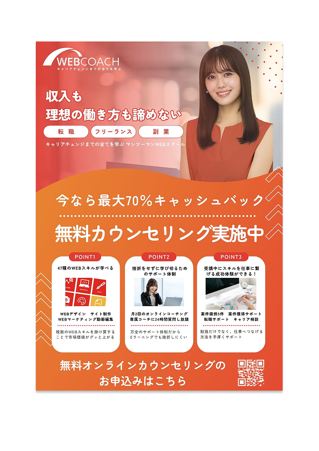 チラシ制作 2025年8月15日 Last updated : 2025年8月15日 Webcoach 【製作時間】5時間【使用ソフト】Photoshop・illustrator【担当業務】デザイン【意識した亊】コーポレートカラーを使用し、トンマナを合わせました。