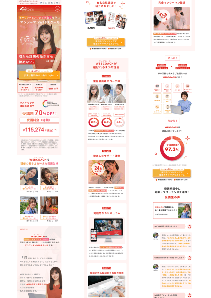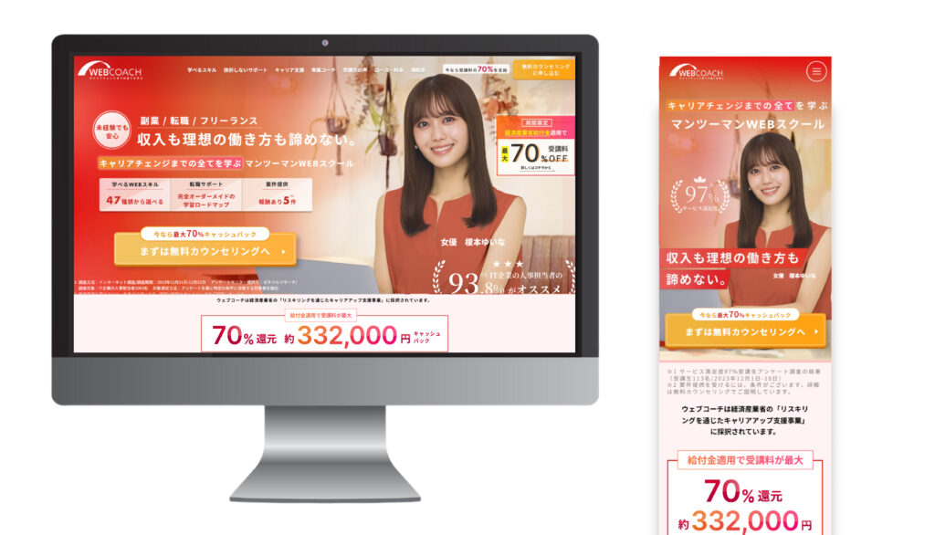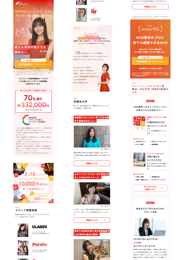ホームページ制作 2025年8月15日 Last updated : 2025年8月18日 Webcoach 【製作時間】20時間【使用ソフト】Wordpress・Photoshop・illustrator・Figma【担当業務】デザイン・実装【意識した亊】どのデバイスでみても見やすくなるようにレスポンシブデザインを行いました。